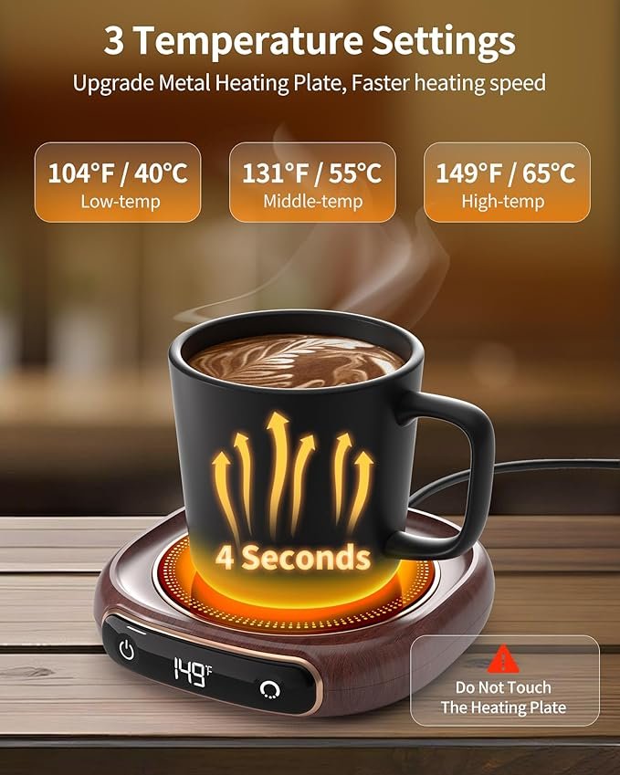 - 【3 ADJUSTABLE Temperature】 Choose from 113°F, 131°F, or 149°F with a simple tap to match your preferred warmth. Perfect for coffee, milk, chocolate, or tea. Best suited for flat/thin-bottomed stainless steel, ceramic, or glass cups. Also works as a candle warmer. Keeps your drink at the ideal temperature whether you’re working or relaxing.