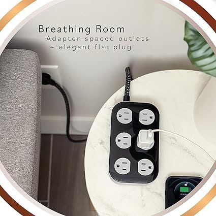 - Aesthetic – The innovative design of the surge protector’s unique round plug, braided fashion cord and modern industrial design is perfect for any stylish or themed home, office, business and more