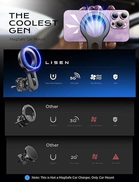 - More Stable, Less Blocking: LISEN has upgraded this magsafe car vent mount from 3 directions.①Upgrade extension arm to protect your phone overheating crash; ②Cell phone holder for car mount with most stable “Steel Hook”;③Magnetic phone car mount that has the strongest magnet force, which can hold up to 10 iPhone 14 Pro Max. LISEN provides at least 1 years of user service.