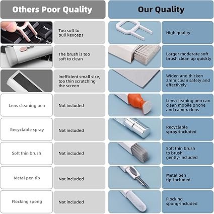- 【MULTIFUNCTIONAL TOOLS 】Mini soft brush and soft plastic lens cleaning pen are specially designed for DSLR camera screen, lens, and other delicate surfaces. 5 more cleaning cloths of it supplied for replacement. The flocking sponge is an excellent tool for cleaning earbuds charging cases, And the earbud cleaning kit is ideal. This electronic cleaner tool is equivalent to 10 other electronic cleaning kit