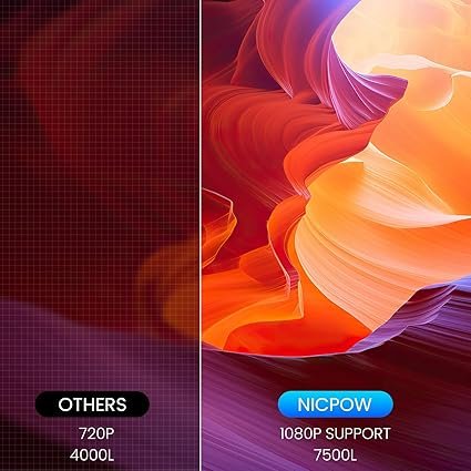 - 🔥【Updated System & 65,000 Lamp Life】NICPOW mini projector supports 1920x1080P resolution, the original resolution is 1280x720P, providing high-definition and bright images and videos. With a projection distance of 3.3 to 16 feet and a viewing size of 32” to 240”, you have a variety of viewing options. The 6000: 1 color contrast, 7500 lux brightness, along with 4: 3/16: 9 aspect ratio, ±15° keystone correction and the longest 65,000 hours lamp life, ensuring a superior viewing experience.