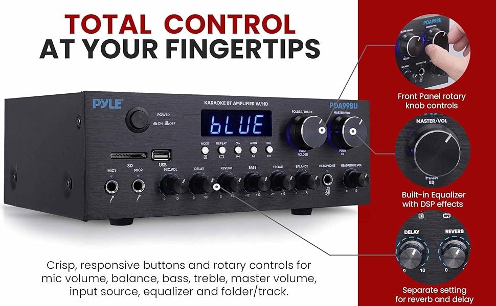 - LED DISPLAY AND CONTROLS: With a digital LED display front panel button, rotary control center, antenna & remote control, this amplifier is great for stage performances. Also has adjusting treble, bass, master & mic volume, reverb delay function